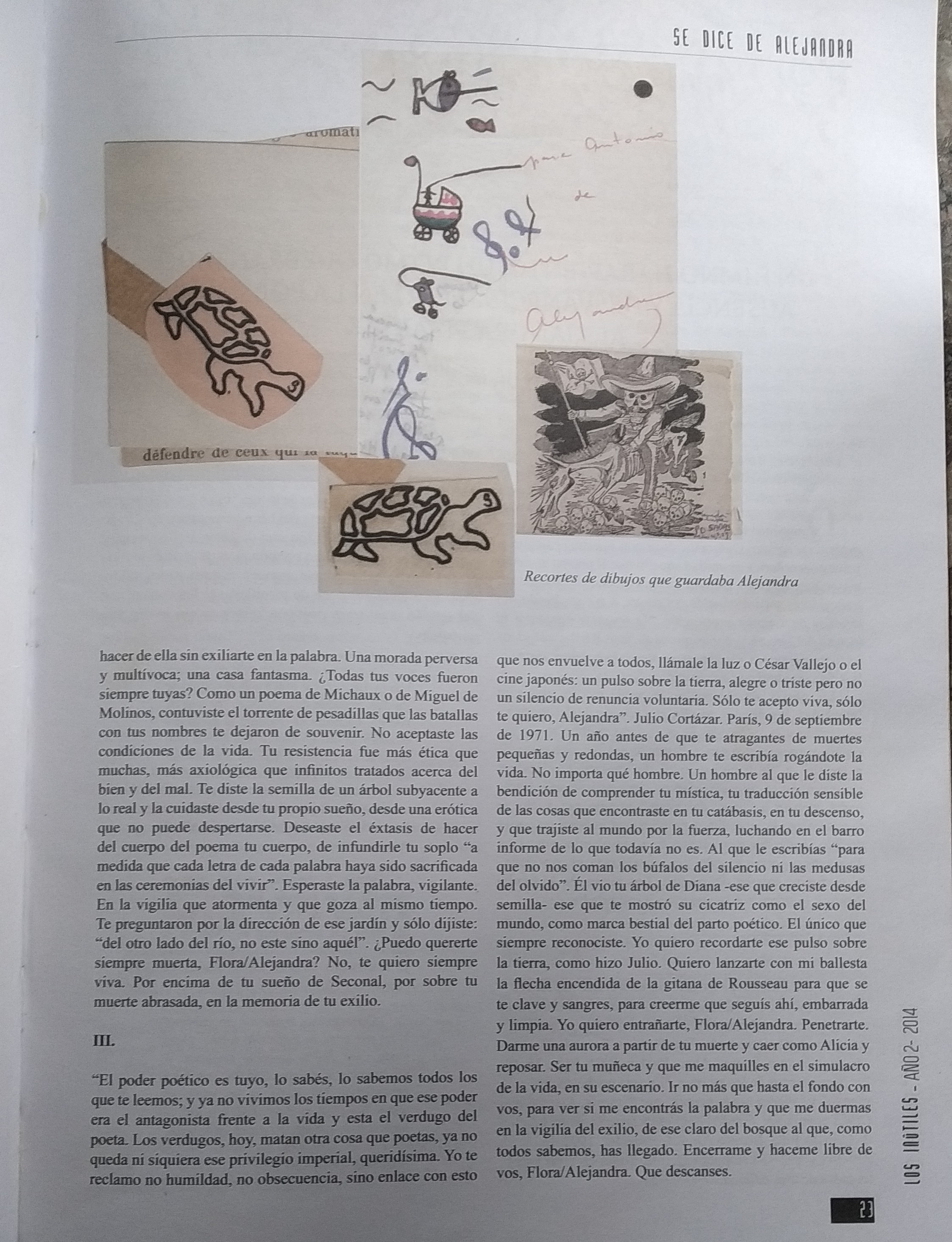 ‘El poder poético es tuyo, lo sabés, lo sabemos todos los que te leemos; y ya no vivimos los tiempos en que ese poder era el antagonista frente a la vida y esta el verdugo del poeta. Los verdugos, hoy, matan otra cosa que poetas, ya no queda ni siquiera ese privilegio imperial, queridísima. Yo te reclamo no humildad, no obsecuencia, sino enlace con esto que nos envuelve a todos, llámale la luz o César Vallejo o el cine japonés: un pulso sobre la tierra, alegre o triste pero no un silencio de renuncia voluntaria. Sólo te acepto viva, sólo te quiero, Alejandra’.