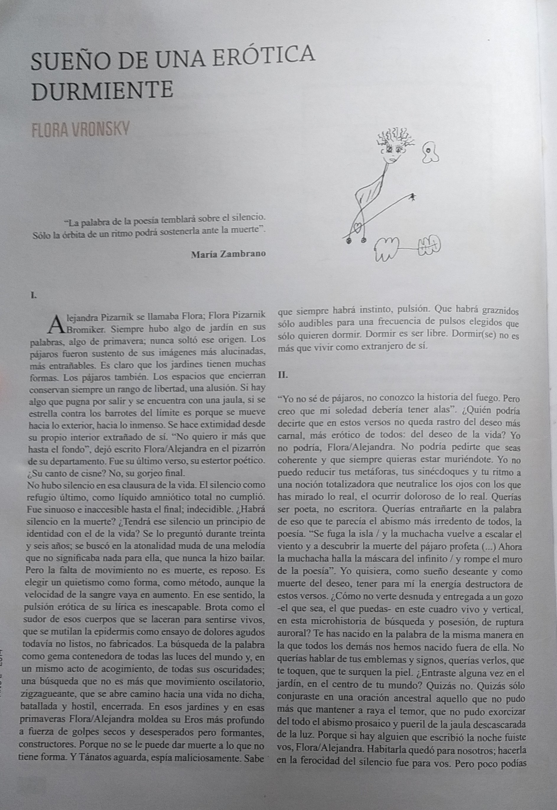 No hubo silencio en esa clausura de la vida. El silencio como refugio último, como líquido amniótico total no cumplió. Fue sinuoso e inaccesible hasta el final; indecidible. ¿Habrá silencio en la muerte? ¿Tendrá ese silencio un principio de identidad con el de la vida? Porque se lo preguntó durante treinta y seis años; porque se buscó en la atonalidad muda de una melodía que no significaba nada para ella, que nunca la hizo bailar. Pero la falta de movimiento no es muerte, es reposo. Es elegir un quietismo como forma, como método, aunque la velocidad de la sangre vaya en aumento. Porque la pulsión erótica de su lírica es inescapable. Brota como el sudor de esos cuerpos que se laceran para sentirse vivos, que se mutilan la epidermis como ensayo de dolores agudos todavía no listos, no fabricados. La búsqueda de la palabra como gema contenedora de todas las luces del mundo y, en un mismo acto de acogimiento, de todas sus oscuridades; una búsqueda que no es más que movimiento oscilatorio, zigzagueante, que se abre camino hacia una vida no dicha, batallada y hostil, encerrada. En esos jardines y en esas primaveras Flora/Alejandra moldea su eros más profundo a fuerza de golpes secos y desesperados pero formantes, constructores. Porque no se le puede dar muerte a lo que no tiene forma. Y tánatos aguarda, espía maliciosamente. Sabe que siempre habrá instinto, pulsión. Que habrá graznidos sólo audibles para una frecuencia de pulsos elegidos que sólo quieren dormir. Dormir es ser libre. Dormir(se) no es más que vivir como extranjero de sí.